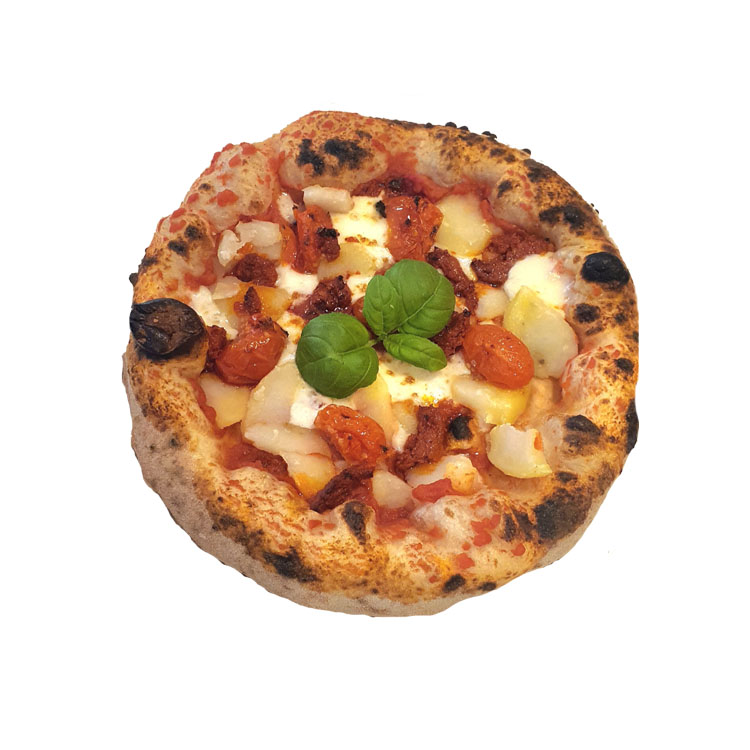 paradicsomszósz, mozzarella, főttkrumpli, Enduja kolbász, bazsalikomfokhagymás sűlt koktélparadicsom
