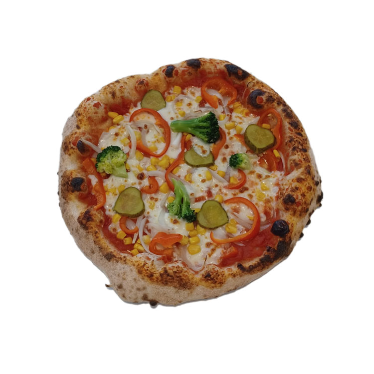 paradicsomszósz, mozzarella, paprika, brokkoli, kukorica, hagyma, csemegeuborka