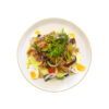 tonhal, főtt tojás, kígyóuborka, paradicsom, rukkola, lilahagyma, olívabogyó