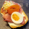Főtt sonkás csemege uborkával: kenyér, vajkrém, főtt sonka, csemegeuborka, trappista sajt.