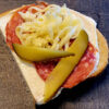 Olasz szalámis feta sajtos: kenyér, vajkrém, olasz szalámi, feta sajt, lila hagyma, olívabogyó.