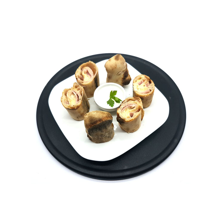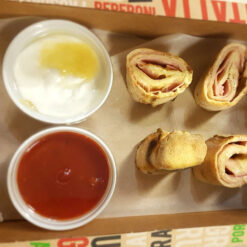 Csavart pizza:főtt sonka,bacon, mozzarella sajt, választható öntet jár hozzá: tejfölös fokhagymás szósz, pizzaszósz, vagy csípős pizzaszósz