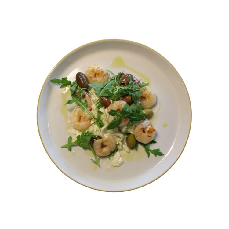 majonézes jégsaláta, ruccola, rák, olívabogyó, paradicsom, olívaolaj